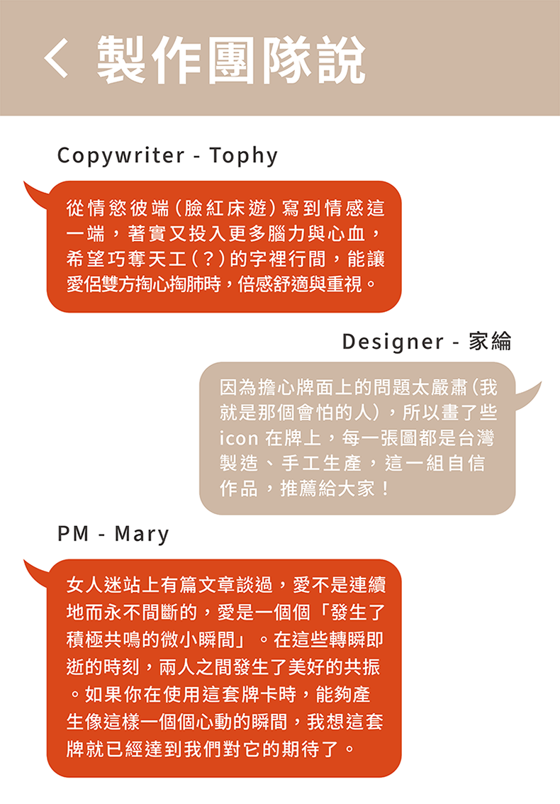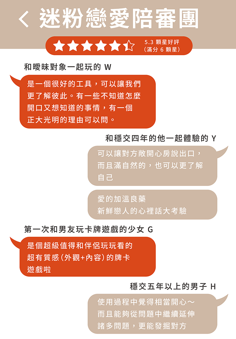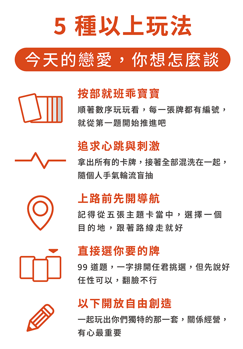 牌卡規格 : 含 99 張問題卡、5 張功能卡、5 款主題體驗卡