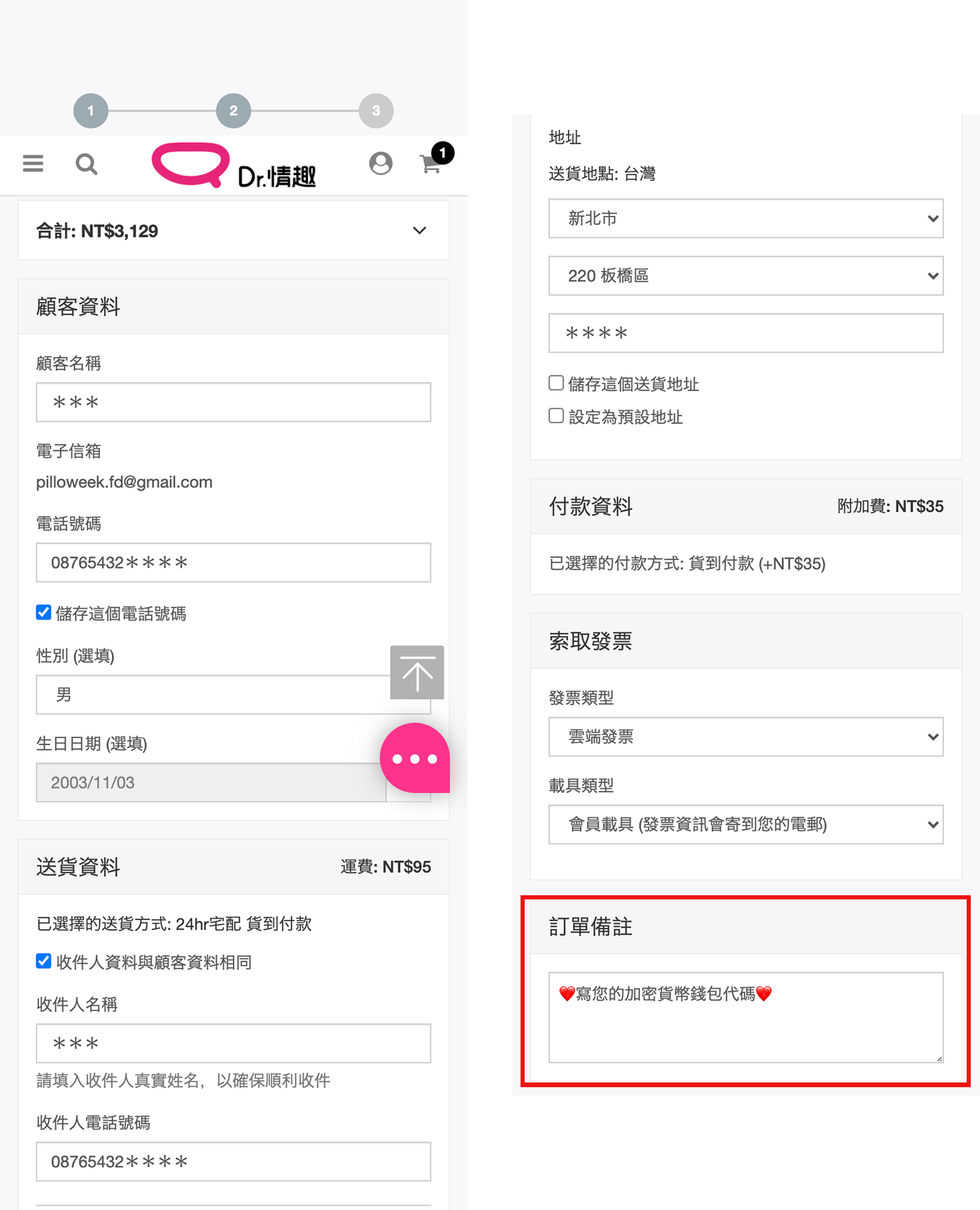 1. 下單後,於結帳頁面備註欄填寫您的加密錢包代碼(2分鐘快速教學)