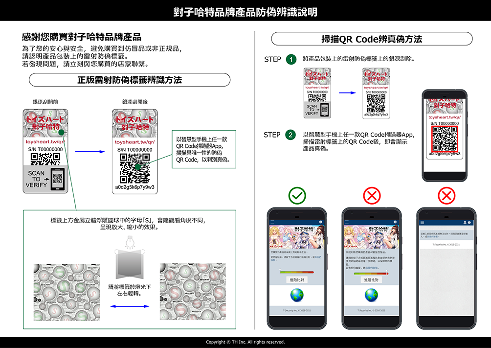 收到商品後,拆封前記掃描貼在商品上的「雷射防偽標章」,刮開銀色圖層後即可掃描,判別真偽的方法如圖。