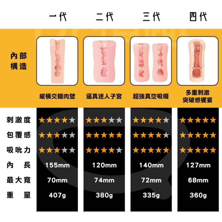 使用較柔軟素材,舒適感、包覆度以及吸力都大幅提升!如果覺得一到三代都太過刺激,第四代的舒適感就像是被小心服侍,絕對舒服!