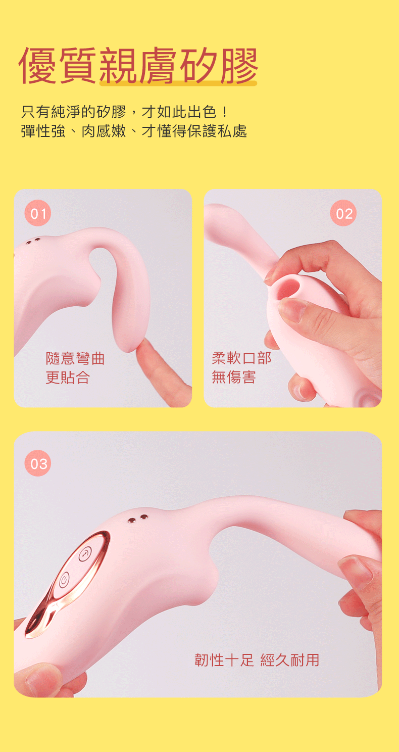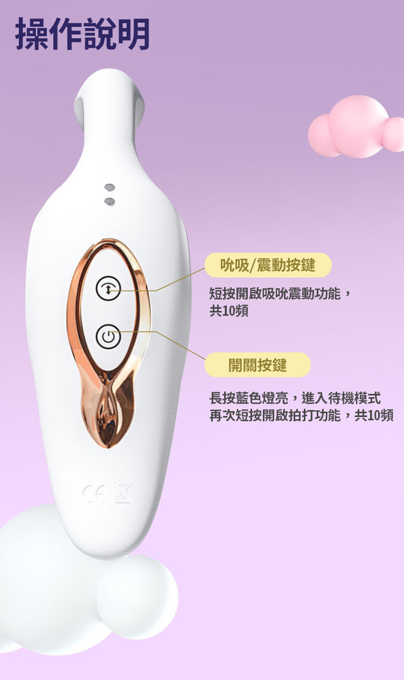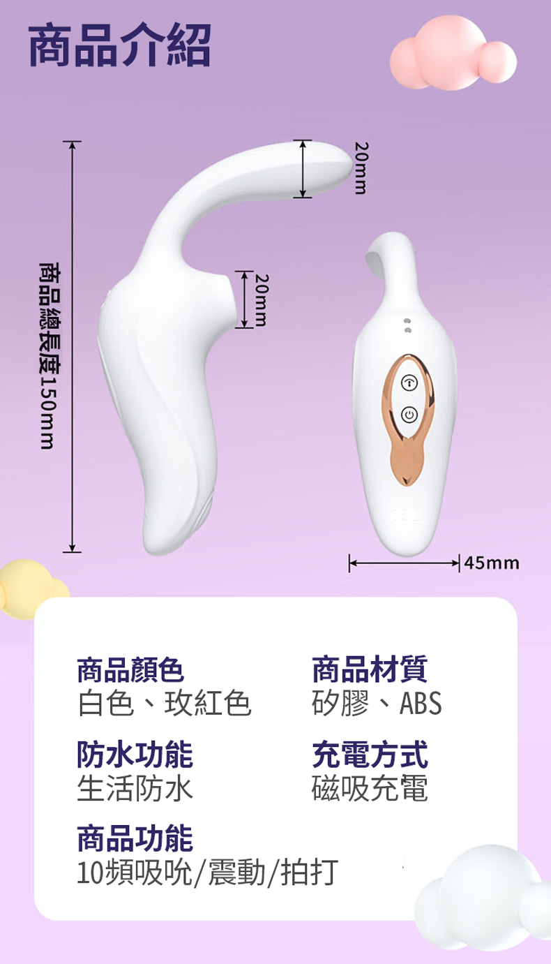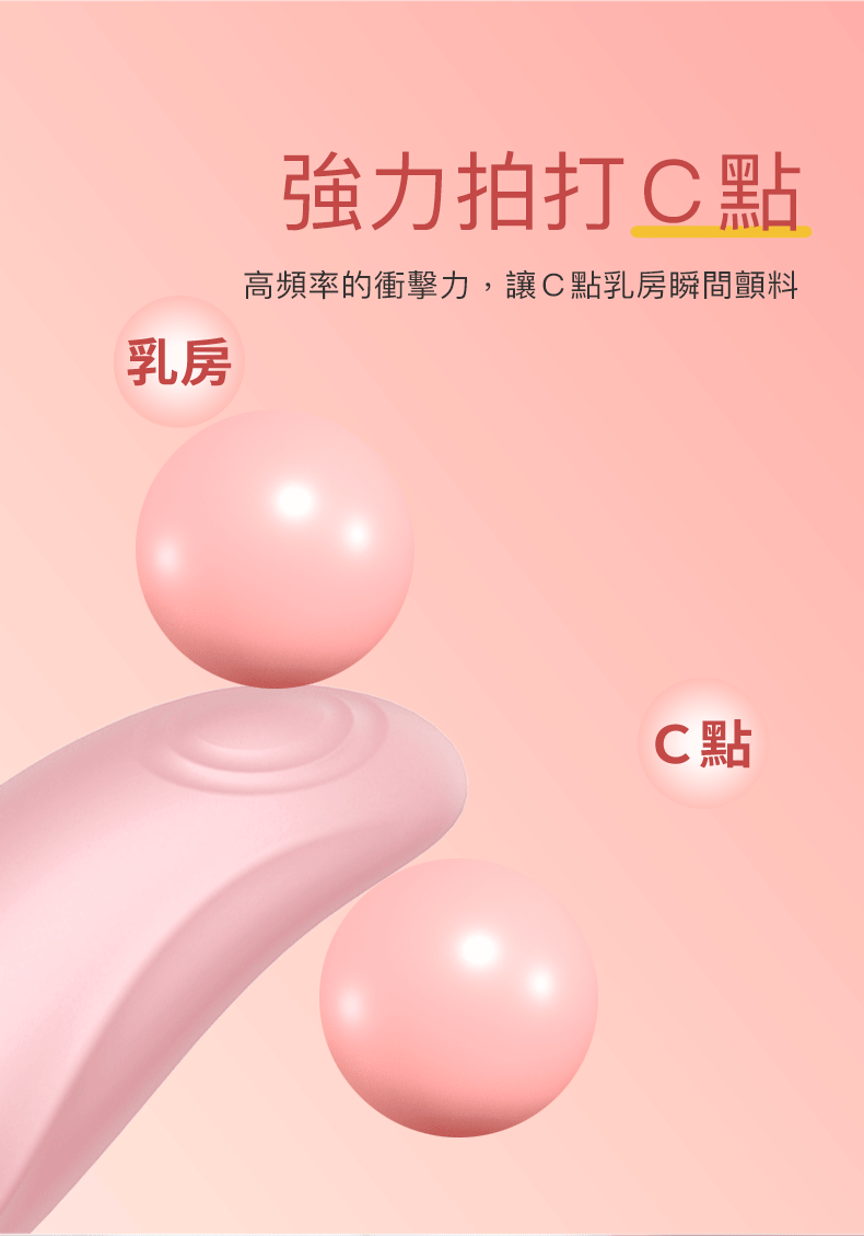 女性人體工學設計,長端插入後,外部吸吮器剛好頂著陰蒂,內外雙震,超級刺激,高潮來的輕而易舉!也能作為伴侶前戲玩具,以尾端拍打功能,深層刺激陰蒂、乳頭、龜頭等敏感帶,爽到不行也超級有趣!