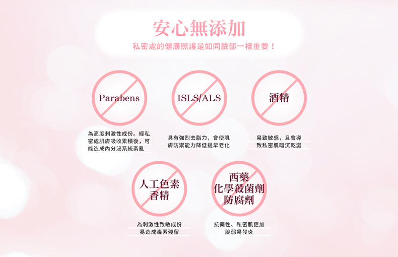 三項高效修復成分。99.9%深入抗菌,長效抑菌、減少異味、高度滋潤、賦活彈性、解決私密不適