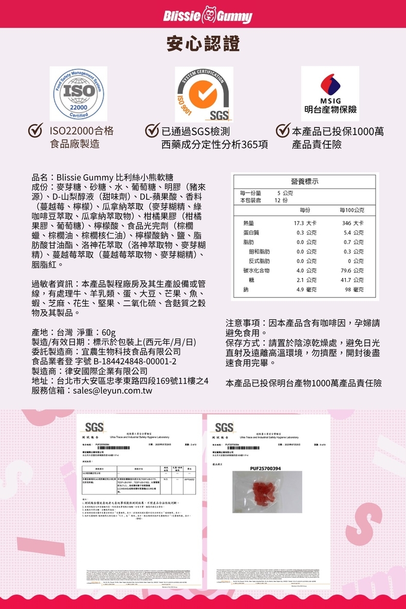 成份:麥芽糖、砂糖、水、葡萄糖、明膠(豬來源)、D-山梨醇液(甜味劑)、DL-蘋果酸、香料(蔓越莓、檸檬)、瓜拿納萃取(麥芽糊精、綠咖啡豆萃取、瓜拿納萃取物)、柑橘果膠(柑橘果膠、葡萄糖)、檸檬酸、食品光完劑(棕櫚蠟、棕櫚油、棕櫚核仁油)、檸檬酸鈉、鹽、脂肪酸甘油酯、洛神花萃取(洛神萃取物、麥芽糊精)、蔓越莓萃取(蔓越莓萃取物、麥芽糊精)、胭脂紅。