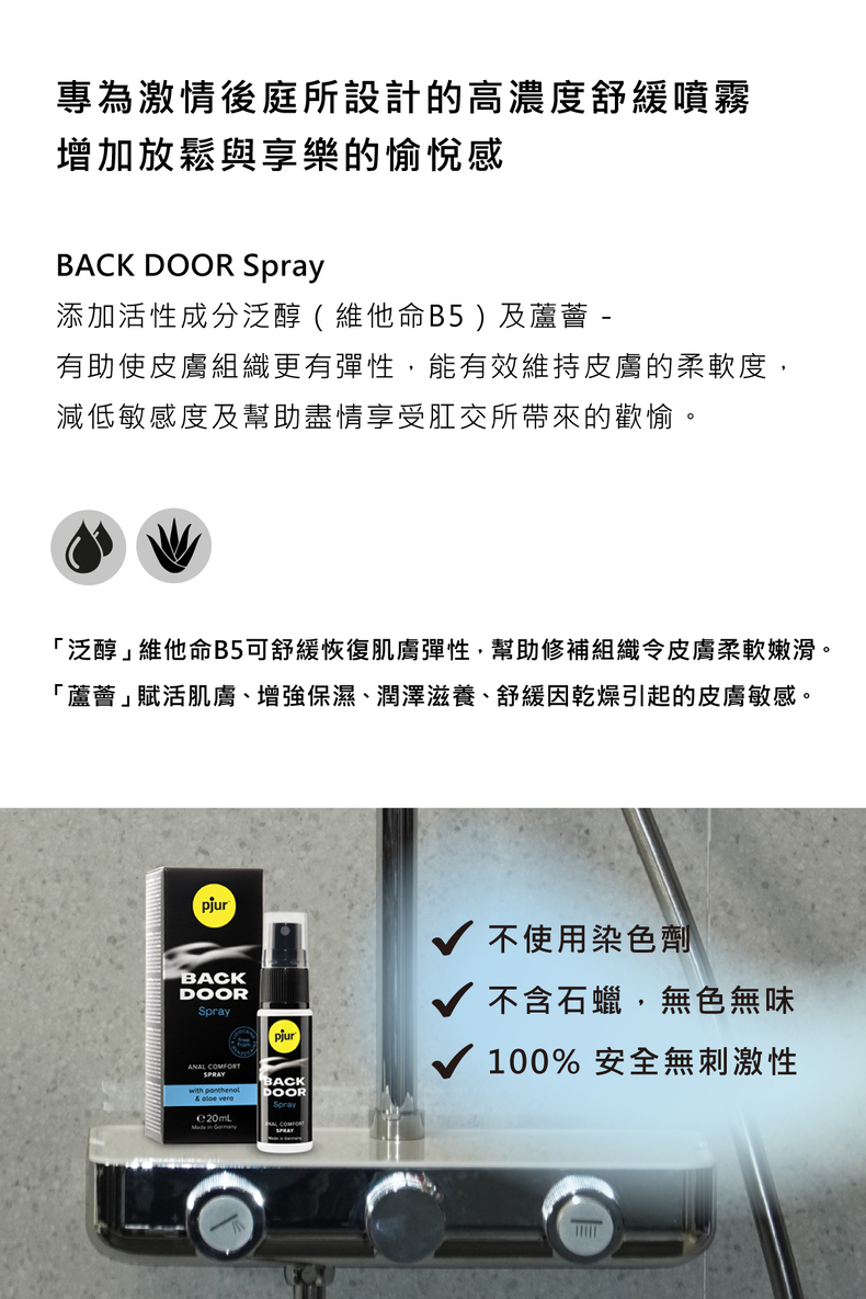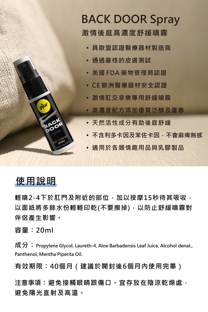 ◼︎BACK DOOR Spray:輕噴2~4下於肛門及附近的部位,加以按摩15秒待其吸收,以面紙將多餘水份輕輕印乾(不要擦掉),以防止舒緩噴霧對伴侶產生影響。