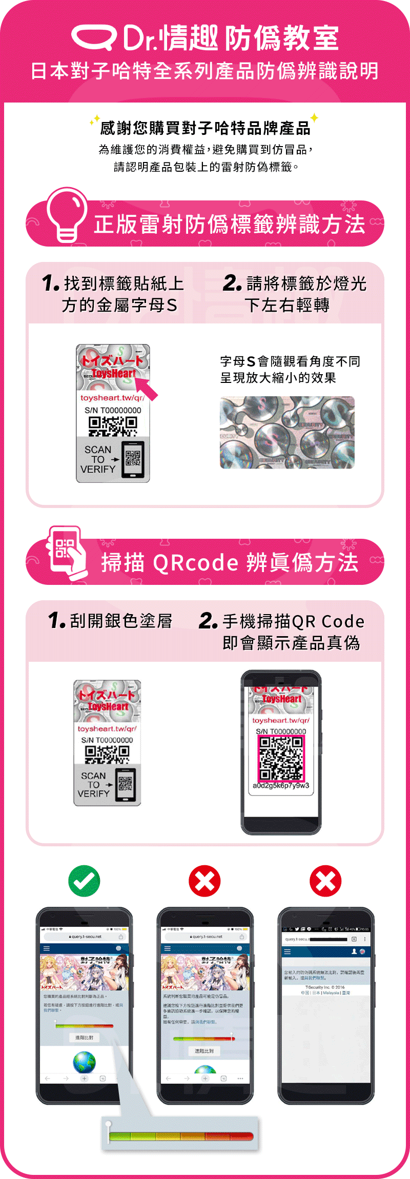 購買 Toy'sHeart 系列產品時,為維護您的消費權益,避免購買到仿冒品請務必認明產品包裝上的雷射防偽標籤。