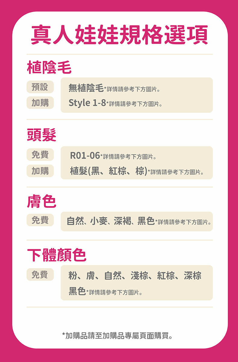 🔸 多種選項,擁有屬於你的真人娃娃