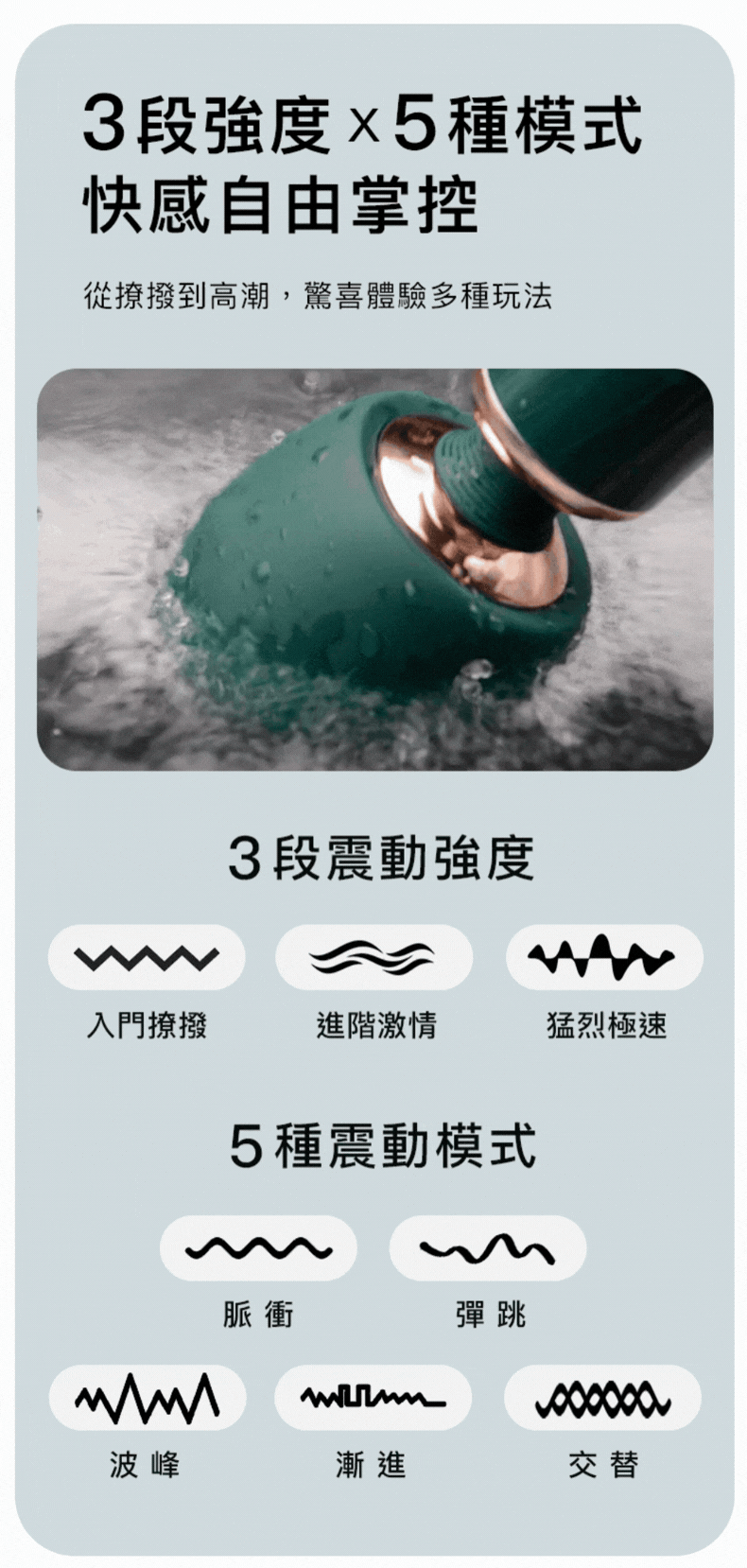 5種頻率X3種強度,多元豐富的震動快感,加上特殊的震動技術,前所未有的深層強震,激發來自深處的絕頂高潮!
