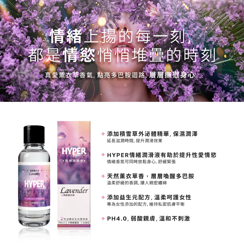 HYPER情緒潤滑液,市售第一款以「情緒香氛」為主,結合外泌體技術,首創「身心皆滋潤」的潤滑液。以高雅香氛為引,在性愛過程中舒緩情緒、釋放多巴胺,加深親密幸福感。HYPER情緒潤滑液裡的外泌體,來自精選積雪草成分,溫和呵護敏感私密肌,在親密互動中形成柔滑防護膜,帶來持久潤澤與舒適感。