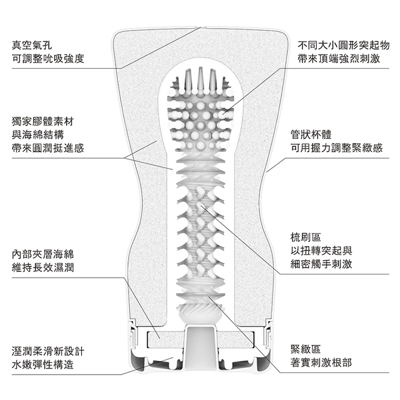 以較軟的管狀容器包裹著飛機杯本體,直接感受握力,要鬆要緊,自己掌握!